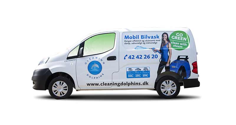 Bilreklame for Cleaning Dolphins udført som halv-indpakning med folieprint og udskåret bilfolie. Kører i København, Storkøbenhavn og Nordsjælland. Bilreklame Type 4/str 3