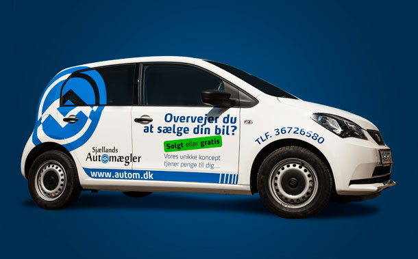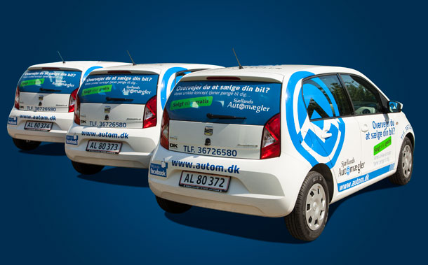 Sjællands Automægler Kunde: Sjællands AutomæglerProjekt:Maksimal reklameflade på Seat Mii. 3 stk. Lånebiler, designet og monteret for Sjællands automægler Grafisk designBilreklame
